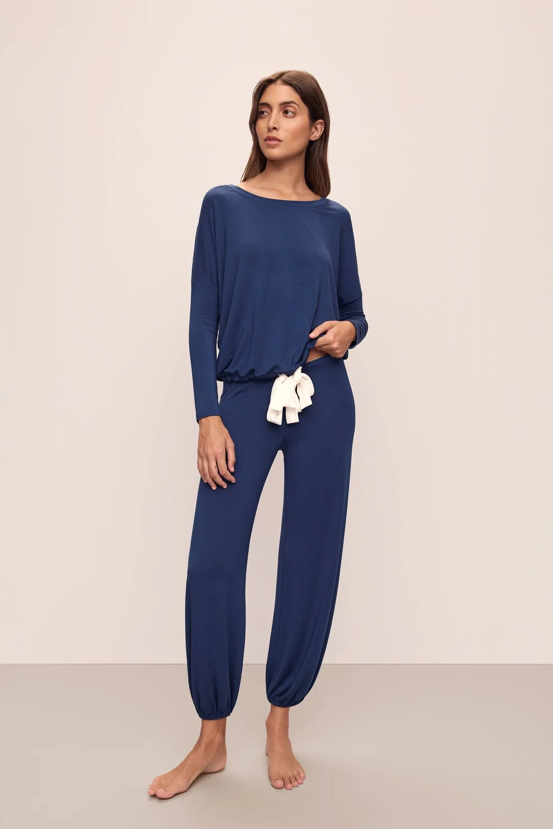 In the mid-2000s, we set out to create the world’s softest pajamas for a beautiful night’s rest. Gisele delivers, merging a classic men’s PJ silhouette with sustainable TENCEL™ Modal fibers. Our luxurious, temperature-regulating knit fabric drapes and falls in all the right ways, enveloping the body in comfort. Plus, it’s machine washable, and gentle on skin, so it not only feels beautiful but it’s easy to care for, too. With its relaxed, slouchy styling and adjustable ties for a custom fit, this set will give you a comfortable night’s sleep. Color: Navy/Ivory DESIGN & FIT - Long sleeve, relaxed drop shoulder with open crew neckline, adjustable tie hem - Low-rise slouchy pant with elasticated hem, adjustable tie waistband - Inseam: 26.25” - Relaxed Fit — roomy, easy silhouette for effortless comfort FABRIC & CARE - Fabric: 95% TENCEL™ Modal, 5% Elastane — ultra-soft, breathable, and naturally drapes for all-day comfort. - Turn inside out before washing. Machine wash cold with like colors on a gentle cycle. Use only non-chlorine bleach when needed. Tumble dry low. Warm iron if necessary. - Imported.