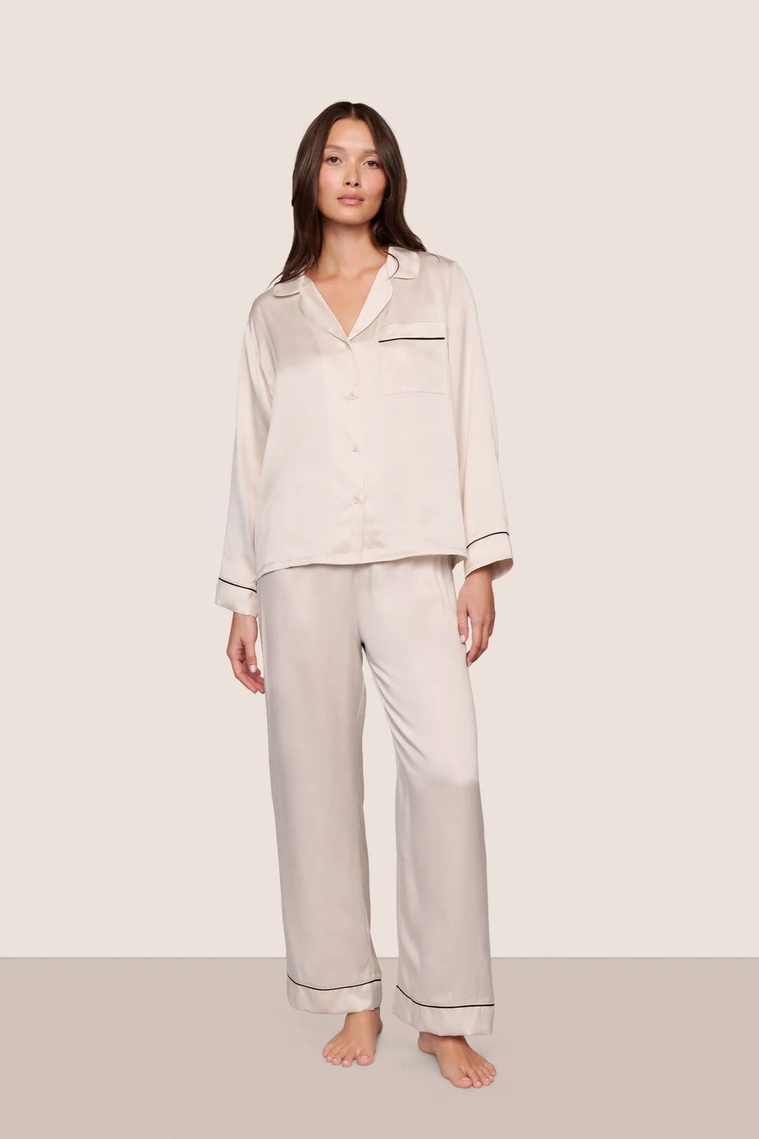 A dream to wear and a dream to wash. Made from 100% mulberry silk, our fabric is produced using bluesign®-certified processes and verified by OEKO-TEX® Standard 100, meaning it is processed without harmful chemicals or dyes in a mill that prioritizes safe and non-toxic practices. It’s hypoallergenic and thermoregulating, offering comfort year-round. This set features a relaxed long-sleeve button-up top with a notch collar and high-rise straight-leg pants with an elastic waistband. Pairs well with our everyday lingerie and Sherpa Slippers. Color: Silver Lilac/Black DESIGN & FIT - Button-front, notch collar, long sleeve, functional chest pocket - Mid-rise straight-leg pant with elastic waistband - Inseam: 29 1/4” (all sizes) - Classic Fit — true to size, comfortable for everyday wear FABRIC & CARE - Fabric: 100% Machine Washable Silk — luxuriously soft and lightweight - Care: Hand wash or machine wash cold on delicate cycle, separately. Remove promptly and lay flat to dry. Do not bleach. Mesh washbag recommended. - Imported