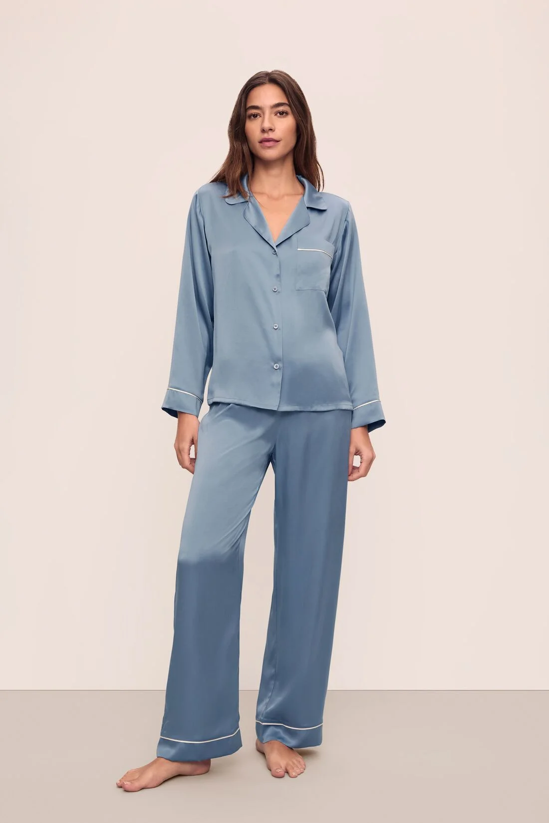 A dream to wear and a dream to wash. Made from 100% mulberry silk, our fabric is produced using bluesign®-certified processes and verified by OEKO-TEX® Standard 100, meaning it is processed without harmful chemicals or dyes in a mill that prioritizes safe and non-toxic practices. It’s hypoallergenic and thermoregulating, offering comfort year-round. This set features a relaxed long-sleeve button-up top with a notch collar and high-rise straight-leg pants with an elastic waistband. Pairs well with our everyday lingerie and Sherpa Slippers. Color: Faded Denim/Ivory DESIGN & FIT - Button-front, notch collar, long sleeve, functional chest pocket - Mid-rise straight-leg pant with elastic waistband - Inseam: 29 1/4” (all sizes) - Classic Fit — true to size, comfortable for everyday wear FABRIC & CARE - Fabric: 100% Machine Washable Silk — luxuriously soft and lightweight - Care: Hand wash or machine wash cold on delicate cycle, separately. Remove promptly and lay flat to dry. Do not bleach. Mesh washbag recommended. - Imported