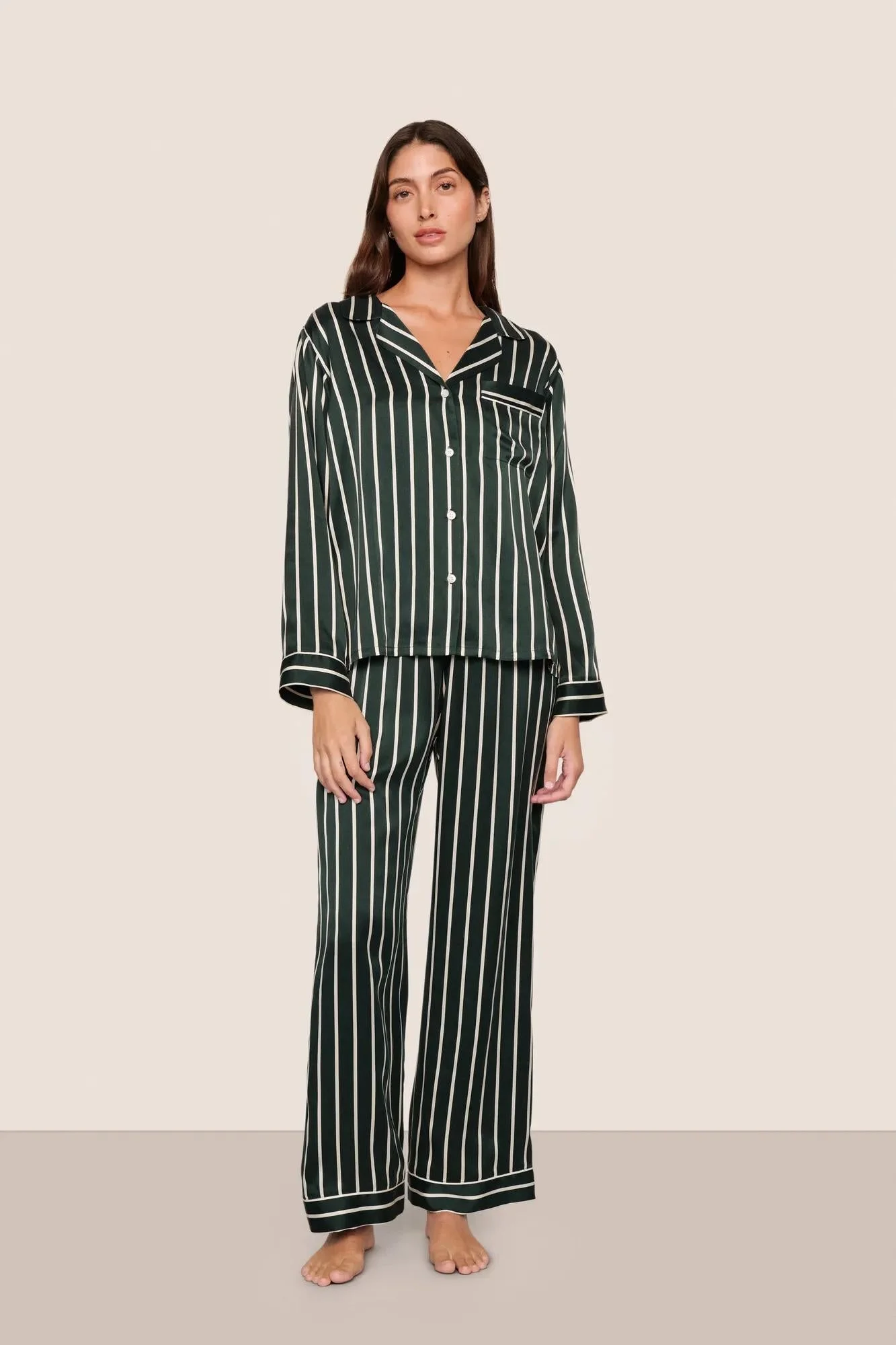 A dream to wear and a dream to wash. Made from 100% mulberry silk, our fabric is produced using bluesign®-certified processes and verified by OEKO-TEX® Standard 100, meaning it is processed without harmful chemicals or dyes in a mill that prioritizes safe and non-toxic practices. It’s hypoallergenic and thermoregulating, offering comfort year-round. This set features a relaxed long-sleeve button-up top with a notch collar and high-rise straight-leg pants with an elastic waistband. Pairs well with our everyday lingerie and Sherpa Slippers. Color: Classic Stripe Pine/Ivory DESIGN & FIT - Button-front, notch collar, long sleeve, functional chest pocket - Mid-rise straight-leg pant with elastic waistband - Inseam: 29 1/4” (all sizes) - Classic Fit — true to size, comfortable for everyday wear FABRIC & CARE - Fabric: 100% Machine Washable Silk — luxuriously soft and lightweight - Care: Hand wash or machine wash cold on delicate cycle, separately. Remove promptly and lay flat to dry. Do not bleach. Mesh washbag recommended. - Imported