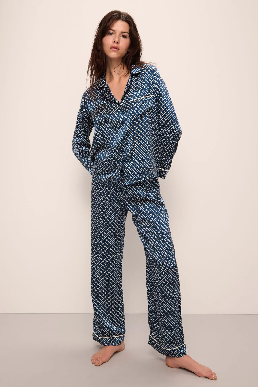 A dream to wear and a dream to wash. Made from 100% mulberry silk, our fabric is produced using bluesign®-certified processes and verified by OEKO-TEX® Standard 100, meaning it is processed without harmful chemicals or dyes in a mill that prioritizes safe and non-toxic practices. It’s hypoallergenic and thermoregulating, offering comfort year-round. This set features a relaxed long-sleeve button-up top with a notch collar and high-rise straight-leg pants with an elastic waistband. Pairs well with our everyday lingerie and Sherpa Slippers. Color: Petite Batik Indigo Blue/Bone DESIGN & FIT - Button-front, notch collar, long sleeve, functional chest pocket - Mid-rise straight-leg pant with elastic waistband - Inseam: 29 1/4” (all sizes) - Classic Fit — true to size, comfortable for everyday wear FABRIC & CARE - Fabric: 100% Machine Washable Silk — luxuriously soft and lightweight - Care: Hand wash or machine wash cold on delicate cycle, separately. Remove promptly and lay flat to dry. Do not bleach. Mesh washbag recommended. - Imported
