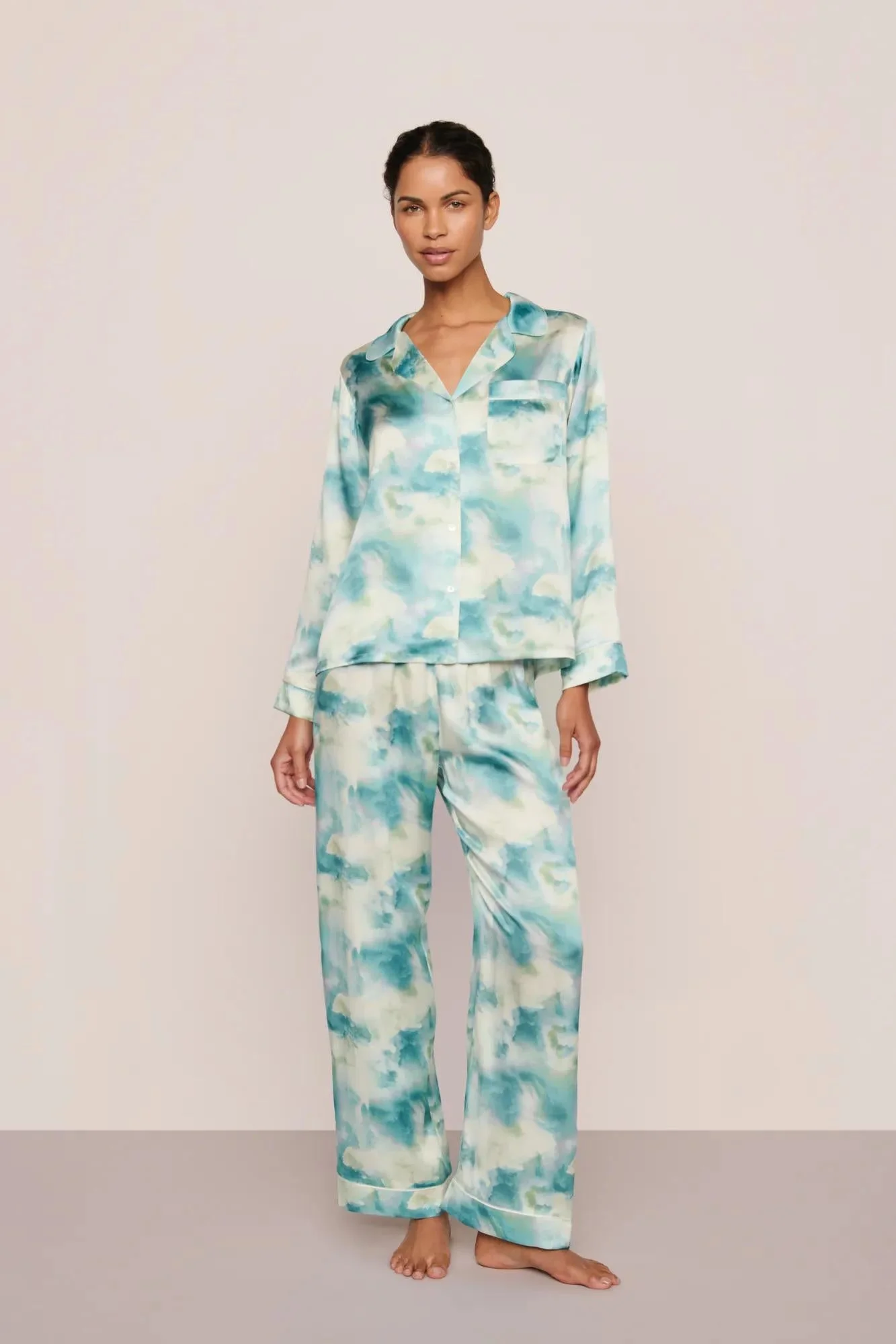A dream to wear and a dream to wash. Made from 100% mulberry silk, our fabric is produced using bluesign®-certified processes and verified by OEKO-TEX® Standard 100, meaning it is processed without harmful chemicals or dyes in a mill that prioritizes safe and non-toxic practices. It’s hypoallergenic and thermoregulating, offering comfort year-round. This set features a relaxed long-sleeve button-up top with a notch collar and high-rise straight-leg pants with an elastic waistband. Pairs well with our everyday lingerie and Sherpa Slippers. Color: Seafoam Sky Blue Lagoon/Ivory DESIGN & FIT - Button-front, notch collar, long sleeve, functional chest pocket - Mid-rise straight-leg pant with elastic waistband - Inseam: 29 1/4” (all sizes) - Classic Fit — true to size, comfortable for everyday wear FABRIC & CARE - Fabric: 100% Machine Washable Silk — luxuriously soft and lightweight - Care: Hand wash or machine wash cold on delicate cycle, separately. Remove promptly and lay flat to dry. Do not bleach. Mesh washbag recommended. - Imported