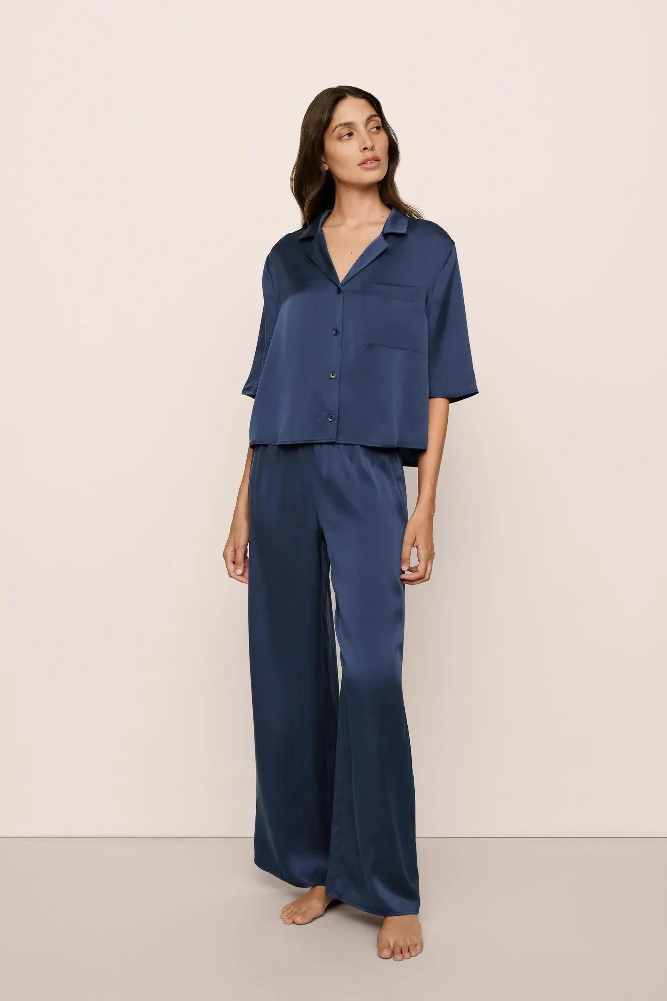 A dream to wear, a dream to wash. Made from 100% mulberry silk, this machine washable fabric is produced using bluesign®-certified processes and verified by OEKO-TEX® Standard 100, meaning our fabric is processed without harmful chemicals and dyes in a mill that uses safe and non-toxic dyes. This set includes a relaxed button-down top with a notch collar and chest pocket, paired with a high-rise straight-leg pant with an elastic waistband. Pairs well with our Sunkissed Soft Stretch Recycled Lace Plunge Bralette and Thong/Bikini. Color: Navy DESIGN & FIT - Boxy button-front, notch collar, short sleeve, functional chest pocket - Mid rise straight leg pant with flat front waistband, forward seams, side seam pockets - Inseam: 30” - Classic Fit — true to size, comfortable for everyday wear
