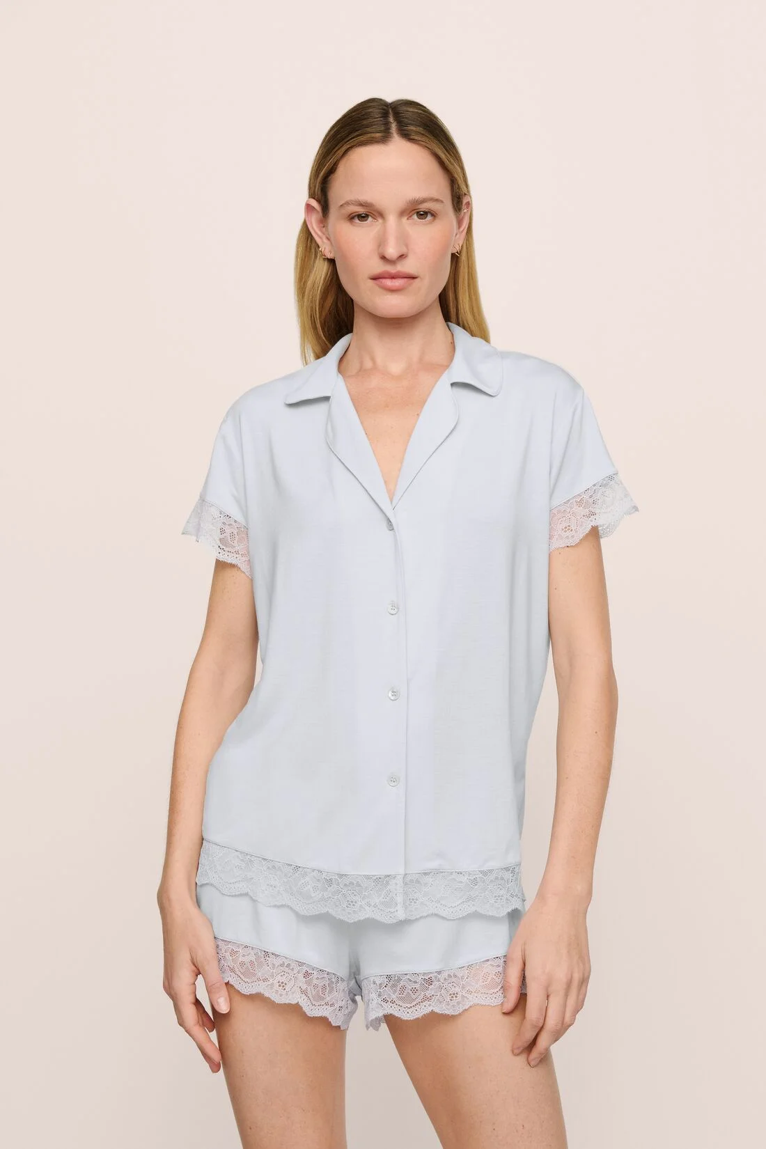 Romanticize your sleep. Made from TENCEL™ Modal fibers and a touch of elastane, this buttery soft fabric is verified by OEKO-TEX® Standard 100, meaning it’s dyed with safe and non-toxic dyes. This set features a short sleeve button front top with notch collar and a low-rise cheeky shot with an elastic waistband. This bridal-ready set pairs well with our Sherpa Slippers. Color: Ice Blue DESIGN & FIT Slim-fit short sleeve, button-front, notch collar, and lace trim -Shortie shorts with thin elastic waistband -Inseam: 2.5” -Slim Fit — tailored, close to the body for a sleek look- Low-rise cheeky shorts with elastic waistband FABRIC & CARE - 95% TENCEL™ Modal, 5% Elastane - Hand wash cold, lay flat to dry - Imported