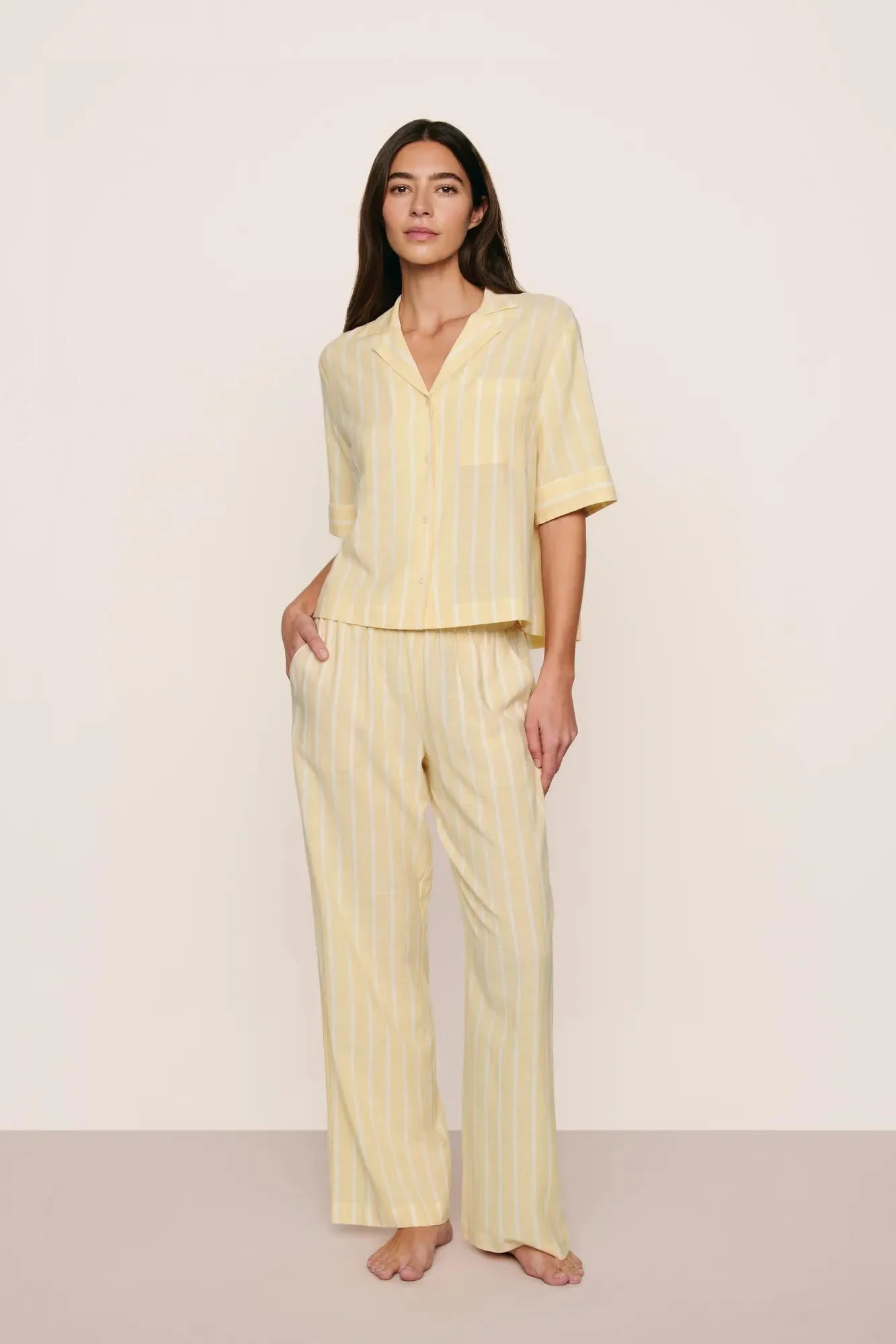 A must-have for hot sleepers and warm temps. Made from ECOVERO™ Viscose and breathable Cotton, this fabric is verified by OEKO-TEX® Standard 100, meaning it was processed without harmful chemicals. Features natural Corozo buttons, a relaxed boxy elbow-length sleeve top with a notch collar, a functional chest pocket, and a straight-leg pant with a mid-rise elastic waistband and slant pockets. Pairs well with the Ivory Soft Stretch Recycled Lace Plunge Bralette and Thong/Bikini. Color: Classic Stripe Sunbeam/Ivory DESIGN & FIT - Boxy elbow-length sleeve button-down top with notch collar and functional chest pocket - Mid-rise straight leg pant with elastic waistband and slant pockets - Relaxed Fit — roomy, easy silhouette for effortless comfort FABRIC & CARE - 63% ECO-Vero Viscose, 37% BCI Cotton - Machine wash cold with like colors; do not bleach; tumble dry low; cool iron if needed - Imported