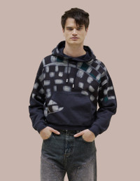 Made of brushed French terry with a relaxed, cropped fit. Garment dyed in deep navy and finished with a checkered spray design across the body, shoulders, and hood. Features a glossy "Eckhaus Latta" logo on the shoulder. Oliver is 6' and wears a size medium, May is 5'10 and wears a size small 100% Cotton Produced in Peru.