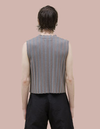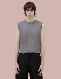 Classic boxy crewneck vest in 100% merino wool with a contrast striped wide rib. Features our new intarsia knit EL logo in red. XS: 52.7CM LENGTH, 43.8CM CHEST, 38.1CM SHOULDER, 44.5CM BOTTOMS: 54.3CM LENGTH, 46.4CM CHEST, 39.4CM SHOULDER, 47.0CM BOTTOMM: 55.9CM LENGTH, 48.9CM CHEST, 40.6CM SHOULDER, 49.5CM BOTTOML: 57.5CM LENGTH, 52.7CM CHEST, 41.9CM SHOULDER, 53.3CM BOTTOMXL: 59.1CM LENGTH, 56.5CM CHEST, 43.2CM SHOULDER, 57.2CM BOTTOM Mitchel is 6'2.5 and wears a size medium 100% MERINO Produced in China.