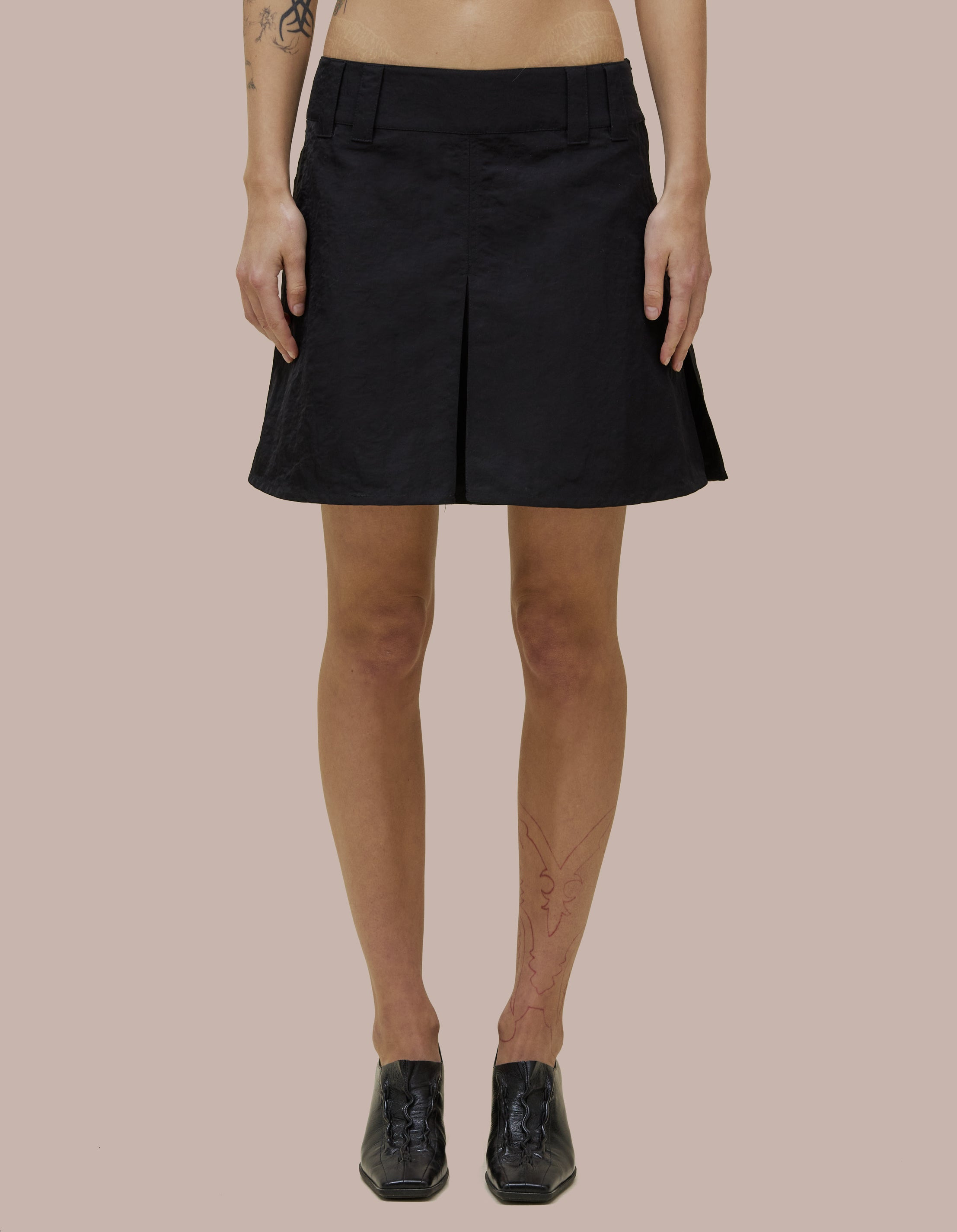 Low-rise miniskirt in Italian nylon with kick pleats for a flared silhouette. Finished with an invisible zip at the side seam. XS: 36CM WAIST, 46CM HIP, 42CM TOTAL LENGTH S: 38CM WAIST, 46CM HIP, 42CM TOTAL LENGTH M: 40CM WAIST, 50CM HIP, 45CM TOTAL LENGTH L: 42CM WAIST, 54CM HIP, 49CM TOTAL LENGTH XL: 44CM WAIST, 54CM HIP, 49CM TOTAL LENGTH Sarah is 5'10.5 and wears a size small 51% RECYCLED NYLON 49% NYLON Produced in China.
