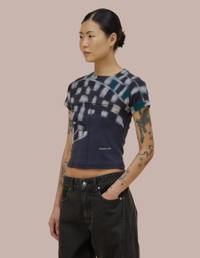 Our classic lapped baby tee in a 1x1 cotton baby rib. Fitted, slightly cropped. Topstitched raw edged seams create form-flattering vertical and horizontal lines across the body. Garment dyed in deep navy with a checkered spray design across the body and shoulders. Finished with a white screenprinted logo on the abdomen. XS: 43CM LENGTH CENTER BACK, 34CM CHEST WIDTH, 30CM SHOULDER WIDTH, 12CM SLEEVE LENGTH, 31CM BOTTOM WIDTH S: 44.5CM LENGTH CENTER BACK, 35.5CM CHEST WIDTH, 31CM SHOULDER WIDTH, 13CM SLEEVE LENGTH, 33CM BOTTOM WIDTH M: 46CM LENGTH CENTER BACK, 37.5CM CHEST WIDTH, 32.5CM SHOULDER WIDTH, 14.3CM SLEEVE LENGTH, 35CM BOTTOM WIDTH L: 48CM LENGTH CENTER BACK, 39.5CM CHEST WIDTH, 33.5CM SHOULDER WIDTH, 15.5CM SLEEVE LENGTH, 36CM BOTTOM WIDTH XL: 49.5CM LENGTH CENTER BACK, 41.3CM CHEST WIDTH, 35CM SHOULDER WIDTH, 16.8CM SLEEVE LENGTH, 38CM BOTTOM WIDTH May is 5'10 and wears a size small 100% Cotton Produced in Peru.