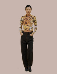 Our classic lapped baby turtleneck in a 1x1 cotton baby rib. Topstitched raw edged seams create form-flattering vertical and horizontal lines across the body. Garment washed in a faux cheetah print using hand-applied dye techniques. Finished with a green "Eckhaus Latta" logo on the abdomen. XS: 48CM FRONT LENGTH, 45CM BACK LENGTH, 34CM CHEST WIDTH, 27CM SHOULDER WIDTH, 71CM SLEEVE LENGTH, 32CM BOTTOM WIDTH S: 49CM FRONT LENGTH, 46.5CM BACK LENGTH, 36CM CHEST WIDTH, 29CM SHOULDER WIDTH, 72.5CM SLEEVE LENGTH, 34CM BOTTOM WIDTH M: 51CM FRONT LENGTH, 48CM BACK LENGTH, 37.5CM CHEST WIDTH, 30CM SHOULDER WIDTH, 73.5CM SLEEVE LENGTH, 36CM BOTTOM WIDTH L: 52.5CM FRONT LENGTH, 49.5CM BACK LENGTH, 39.5CM CHEST WIDTH, 31CM SHOULDER WIDTH, 75CM SLEEVE LENGTH, 38CM BOTTOM WIDTH XL: 54CM FRONT LENGTH, 51CM BACK LENGTH, 41.5CM CHEST WIDTH, 32.5CM SHOULDER WIDTH, 76CM SLEEVE LENGTH, 40CM BOTTOM WIDTH May is 5'10 and wears a size small 100% Cotton Produced in Peru.