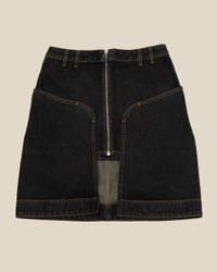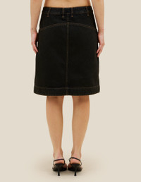 Mid-rise midi skirt in 14oz black cotton denim, tinted and stone-washed, featuring a nested zip-front design and two front pockets. Model wears size Small 100% COTTON Produced in the USA