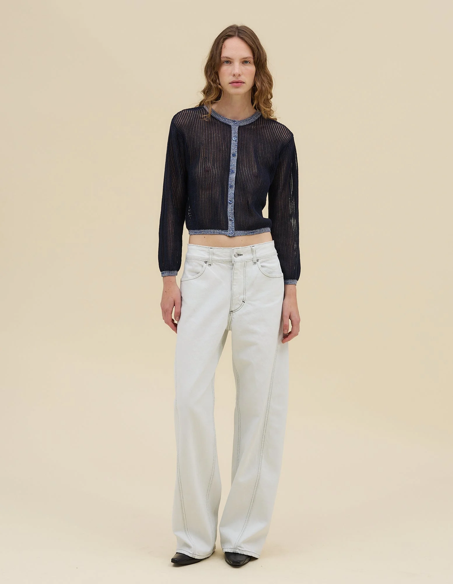 Relaxed-fit button-front cardigan in a cotton and cashmere blend, featuring a knitted square mesh with rib stripe details. Model wears a size Small 90% COTTON 5% CASHMERE 4% RECYCLED POLYESTER 1% LINEN Produced in China