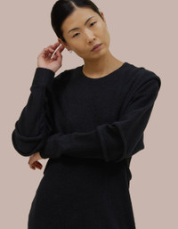 A mini dress featuring dolman sleeves and bound curvilinear seams creating definition as they move across your body. Made from a boiled wool cotton blend. Model wears size small 53% WOOL 47% COTTON Produced in China