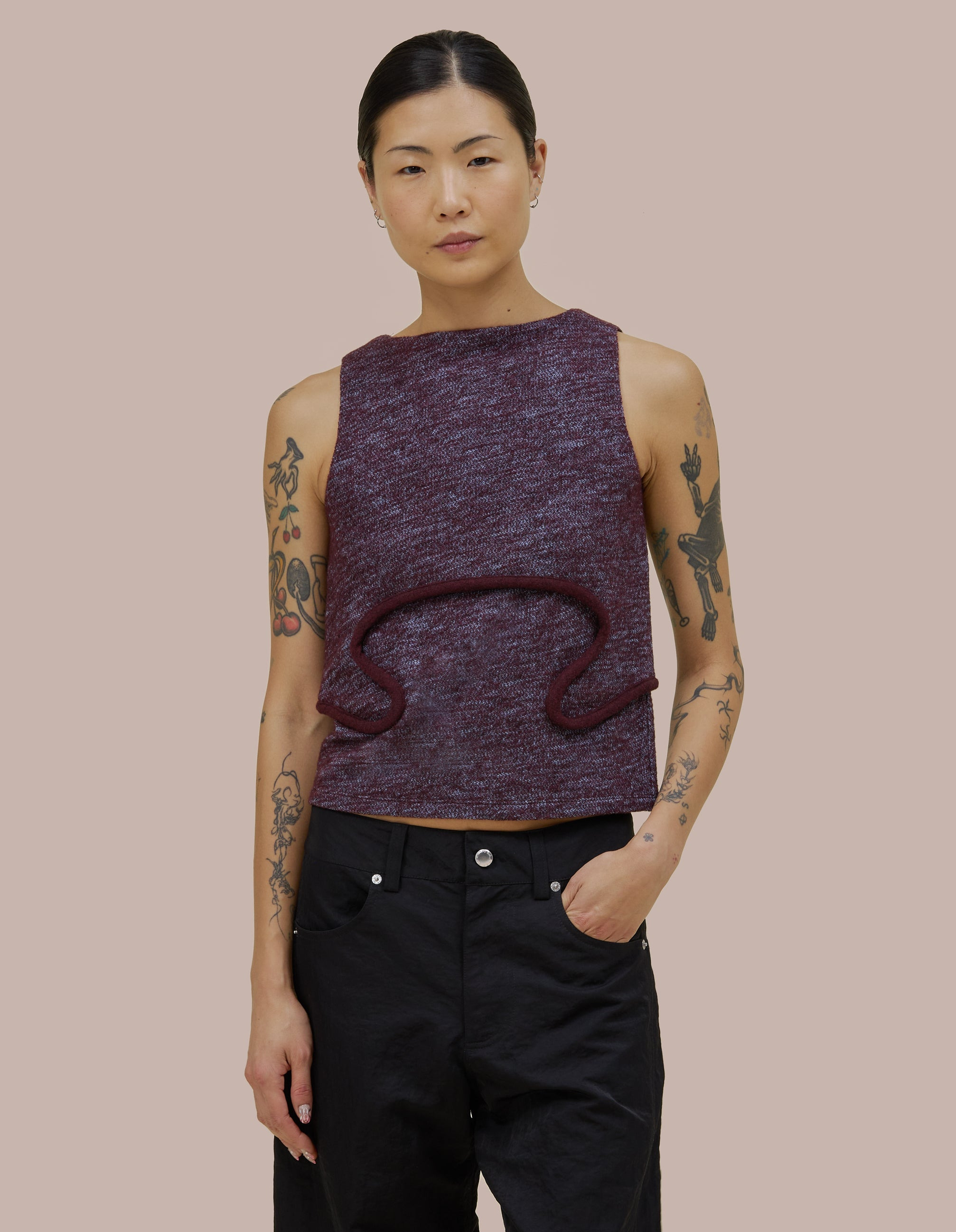This tank features a boat neck with a boxy fit and bound curvilinear seams creating definition as they move across your body. Made from a boiled wool cotton blend. XS: 21.75 center front length, 16.25 chest width, 9 neck width seam S: 22.37 center front length, 17.25 chest width, 9.25 neck width seam M: 23 center front length, 18.25 chest width, 9.5 neck width seam L: 23.62 center front length, 19.25 chest width, 9.75 neck width seam XL: 24.25 center front length, 20.25 chest width, 10 neck width seam Model wears size small 53% WOOL 47% COTTON Produced in China