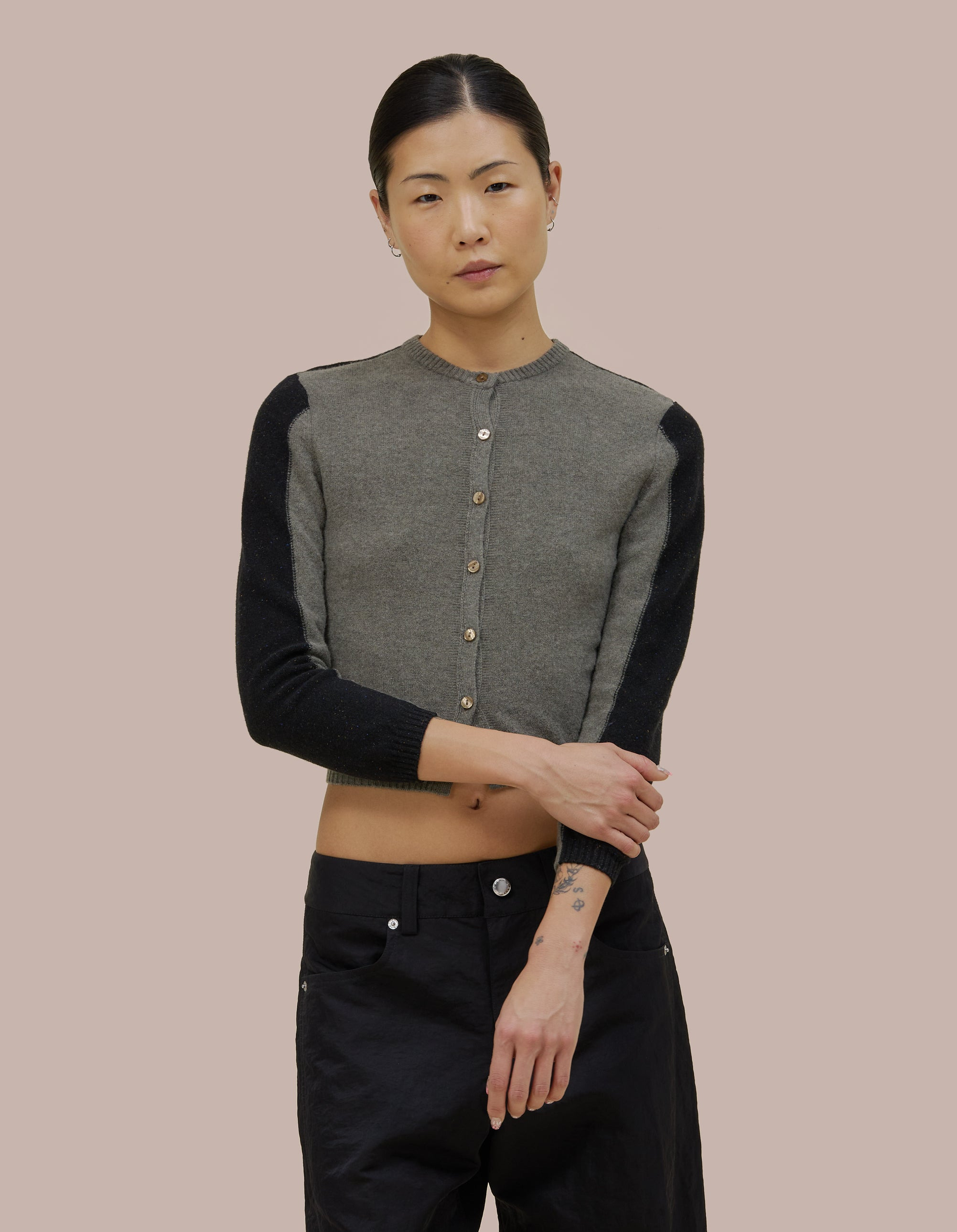 Button front cardigan with a cropped shrunken fit. Featuring colorblocking and speckled donegal details throughout, finished with Eckhaus Latta logo buttons. XS: 36.2CM CHEST, 43.2CM FRONT LENGTH, 61CM SLEEVE LENGTH S: 38.7CM CHEST, 45CM FRONT LENGTH, 63.5CM SLEEVE LENGTH M: 41.3CM CHEST, 47CM FRONT LENGTH, 66CM SLEEVE LENGTH L: 43.8CM CHEST, 48.9CM FRONT LENGTH, 68.5CM SLEEVE LENGTH XL: 46.4CM CHEST, 50.8CM FRONT LENGTH, 71CM SLEEVE LENGTH May is 5'10 and wears size small. 100% EXTRAFINE MERINO Produced in China.
