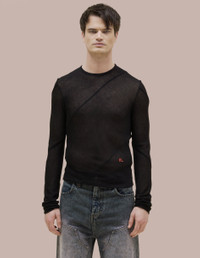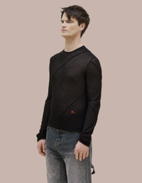 Bias cut longsleeve crewneck made from an open gauge semi-sheer rib. Sleeves constructed with spiraling seams and finished with red EL logo embroidered on the lower left abdomen. Camilla is 5'9 and wears a size small, Oliver is 6' and wears a size medium medium 85% RAYON 15% NYLON Produced in China