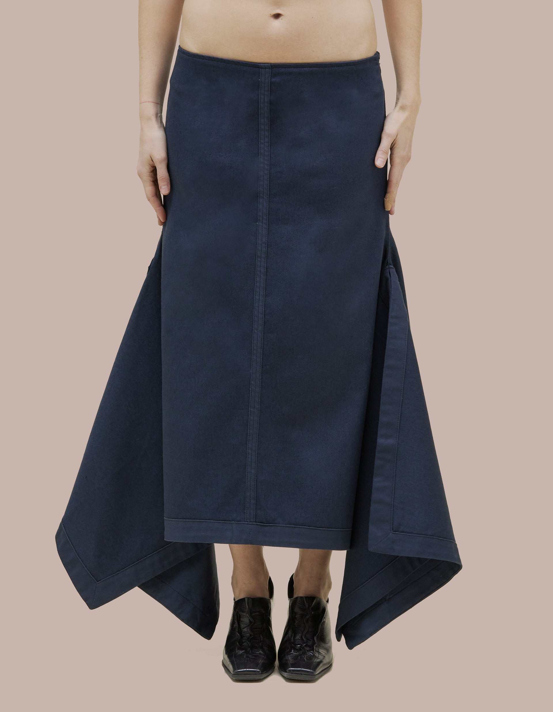 Mid-rise skirt in 9oz Japanese denim with an exaggerated handkerchief hem that opens at the side seam. Features an invisible zipper and contrast facing and seam details. Camilla is 5'9 and wears a size small 100% COTTON Produced in USA.