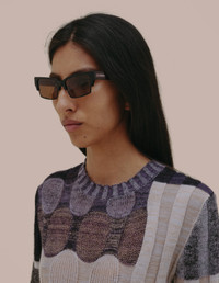 Unique take on the browline silhouette with angular acetate. Black frame contrasted with the organic lens shape in dark Taupe tint. Laminated acetate patchwork temples and embedded silver logo. Handcrafted from bio-circular acetate (recycled plastics). Five barrel hinges with coated ‘safety’ screws. Complete with lens cloth and collapsible pyramid case. Lens cloth made with 100% recycled PET microfiber with custom artwork. Pyramid case made with 100% recycled leather-like PET black case with plush flocked lining and embossed custom branding. Produced in China.