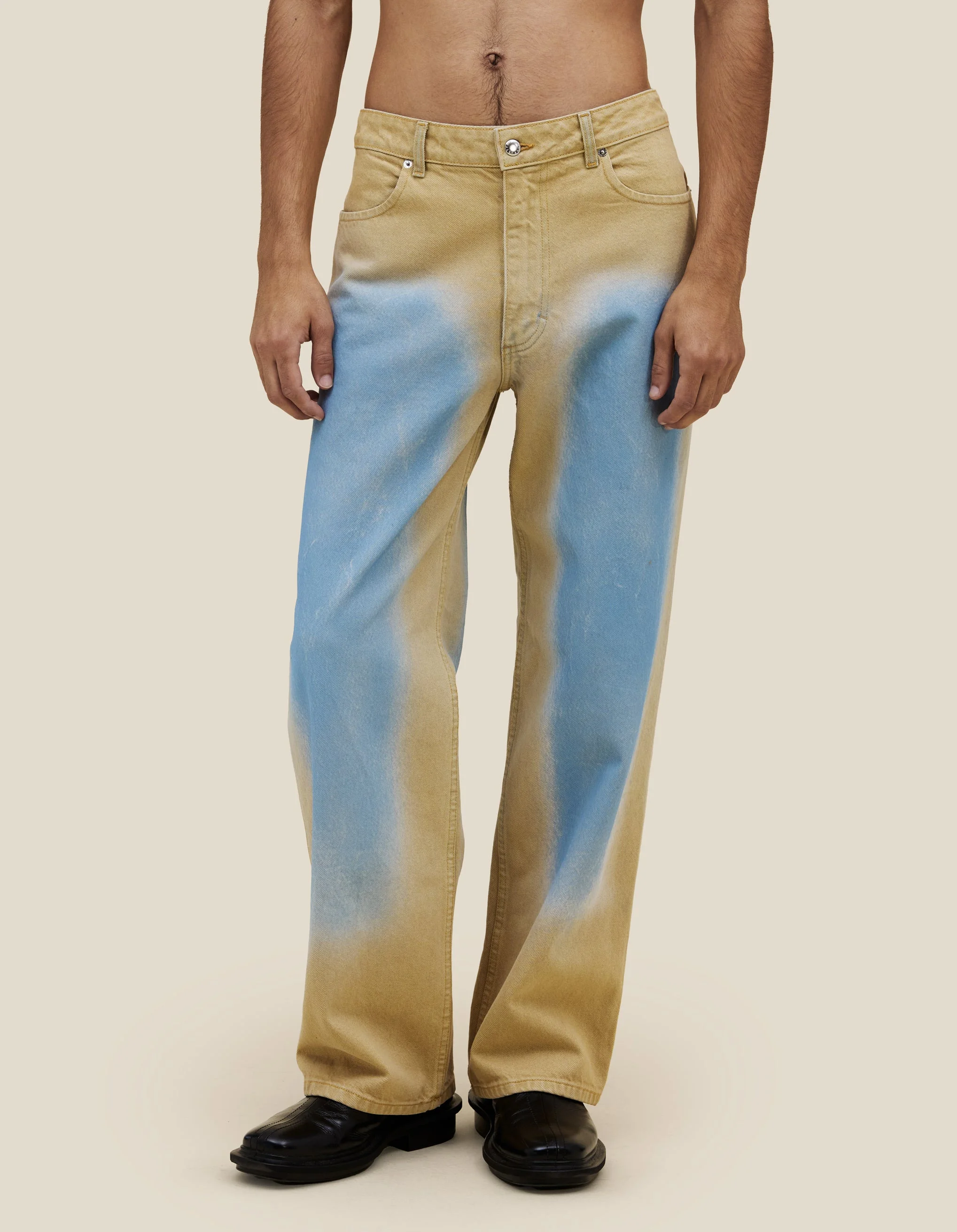 These high-rise, wide-leg jeans are made from 100% cotton 14oz denim, indigo stripped and overdyeed tan with soft blue spray on the front and back legs, featuring signature EL back pockets; the inseam is 30" for sizes 24–29 and 32" for sizes 30–36. Hazem is 6'2 and wears a size 30, Georgia is 5'10 and wears a size 27 100% COTTON Produced in USA