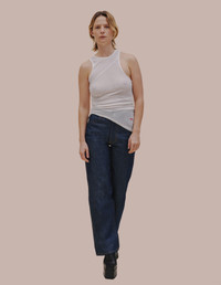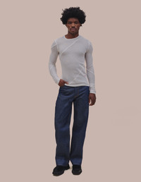Our classic wide leg jeans are cut in an American raw deadstock indigo denim. The jeans are distinguished with our trademark back patch pockets, and have a zip fly closure with a logo shank on the waistband along with rivets on the front pockets in nickel hardware. Mahi is 6'1" and wears a size 30. Camilla is 5'9" and wears a size 27. 100% Cotton. Produced in USA