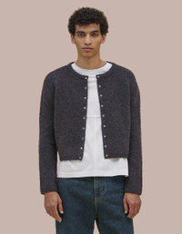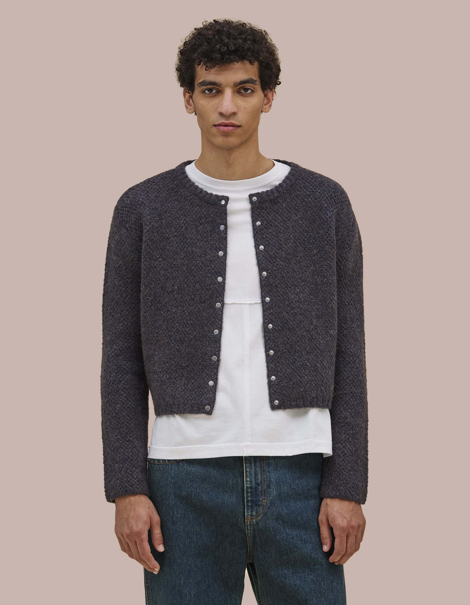 Snap front cardigan constructed from double faced knit. Has a boxy fit that hangs off the body. XS: 18 3/8" CHEST, 18 1/2" FRONT LENGTH, 6" BICEP, 29 3/8" SLEEVE LENGTH, 7 3/4" NECK WIDTH S: 19 3/8" CHEST, 19 1/4" FRONT LENGTH, 6 1/4" BICEP, 30 3/8" SLEEVE LENGTH, 8" NECK WIDTH M: 20 3/8" CHEST, 20" FRONT LENGTH, 6 1/2" BICEP, 31 3/8" SLEEVE LENGTH, 8 1/4" NECK WIDTH L: 21 3/8" CHEST, 20 3/4" FRONT LENGTH, 6 3/4" BICEP, 32 3/8" SLEEVE LENGTH, 8 1/2" NECK WIDTH XL: 22 3/8" CHEST, 21 1/2" FRONT LENGTH, 7" BICEP, 33 3/8" SLEEVE LENGTH, 8 3/4" NECK WIDTH Hazem is 6'1 and wears a size medium, Bianca is 5'10 and wears a size small 16% YAK 15% ALPACA 58% MERINO 11% RECYCLED NYLON Produced in China.
