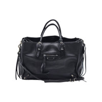 Balenciaga Veau Papier A6 Zip-Around Tote – Black / Silver Hardware This Balenciaga Veau Papier A6 Zip-Around Tote in classic black features the brand’s signature soft leather, clean architectural lines, and functional zip-around silhouette. The leather shows natural creasing and light wear consistent with normal use, while the structure remains strong and well balanced. The handles are sturdy, the zipper operates smoothly, and the interior is clean with light signs of handling, offering plenty of life left for everyday use. • Measures approx. 10” W × 7.25” H × 4” D • Black veau leather with natural texture • Zip-around top closure • Front zip pocket with leather pull • Rolled top handles and detachable shoulder strap • Clean interior with light signs of use • Includes Balenciaga dust bag and mirror We guarantee this item is 100% authentic. Every piece we offer is carefully inspected, sourced responsibly, and presented with accuracy and transparency. The price is firm due to very small margins. The Papier A6 remains one of Balenciaga’s most practical and timeless designs, and black leather examples continue to be in steady demand, making this a strong opportunity for a versatile everyday luxury tote.