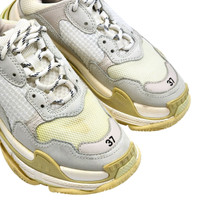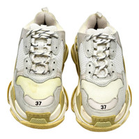 Balenciaga Triple S Women’s Sneakers – 524036 – Beige/Cream/Yellow – Size EU 37 (US 7, UK 4) – Preowned Step into bold luxury with the Balenciaga Triple S, one of the most iconic silhouettes in modern designer footwear. Known for its exaggerated triple-stacked sole and layered construction, this pair features a beige, cream, and yellow palette in mesh and leather. Embroidered size detail at the toe, embossed Balenciaga branding on the outsole, and original laces complete the look. A defining blend of high fashion and streetwear, perfect for collectors and enthusiasts alike. Features: • Triple S – 524036 • Women’s Size EU 37 (US 7, UK 4) • Beige/Cream/Yellow colorway • Multi-layered mesh and leather upper • Heavy rubber outsole with embossed branding • Embroidered size at toe, original laces • Made in China Condition: Preowned, good overall. Slight discoloration and scuffs on uppers, worn soles with integrity intact. Interior and stitching remain solid. See photos for details. We are a trusted family-owned business since 1999, specializing in authentic luxury footwear. All items are inspected, stored securely, and shipped promptly. Buy with confidence.
