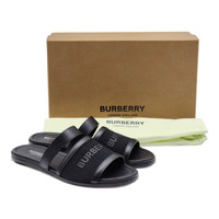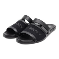 Slip-on canvas with leather sandals with signature Burberry logo on top. Made in Italy. Sizes available: 36, 36.5 Condition: Brand new with box.