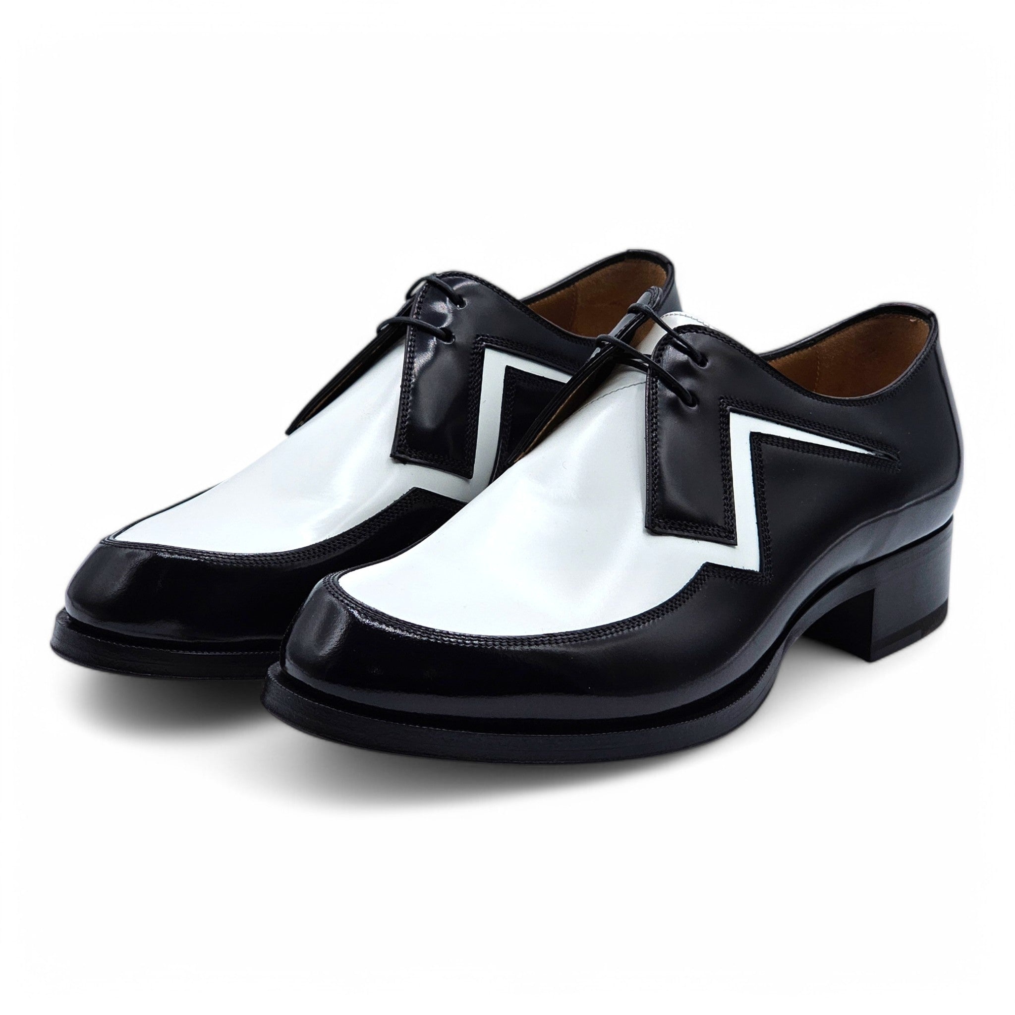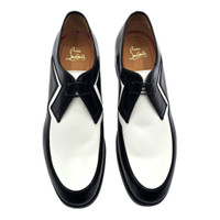Christian Louboutin 2-Tone Jazz Derby Shoes – Leather – Black/White – Size 41 Step into the spotlight with these Christian Louboutin 2-Tone Jazz Derby Shoes , a bold fusion of classic elegance and electrifying showmanship. Crafted from premium black and white leather , these striking derbies channel the golden age of jazz and rock ‘n’ roll, exuding effortless charisma with every step. The sleek, high-shine finish and sharp, angular design make a statement that’s impossible to ignore. A zigzag contrast detail adds a rebellious edge, nodding to vintage spectator shoes worn by swing kings and rockabilly legends. Beneath it all, the signature Louboutin red sole delivers an unmistakable touch of luxury and flair. Perfect for those who dare to stand out, whether on the dance floor, the stage, or the streets. Slip these on, and let your shoes do the talking. Details: Size: EU 41 / US 8 Material: Leather Color: Black/White Origin: Made in Italy Condition: New with box (box is damaged) Signature Louboutin red sole for an unmistakable touch of luxury