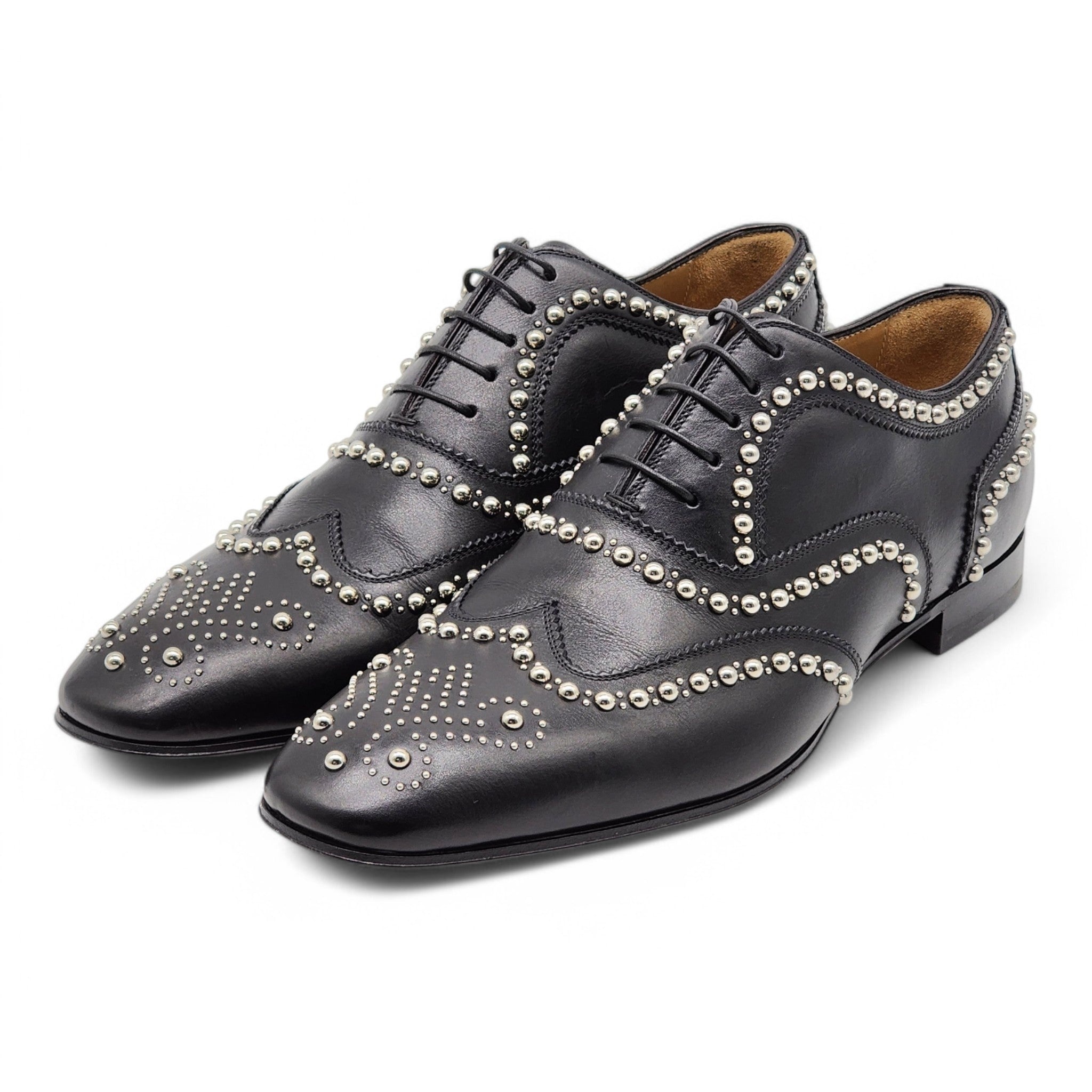 Make a bold statement with the Christian Louboutin Charlie Clou Studded Oxford Shoes , a perfect blend of classic sophistication and edgy detailing . Crafted from premium black leather , these oxfords feature sleek stud embellishments along the toe cap and sides, adding a modern, rebellious touch to a timeless silhouette. The polished finish and almond-toe design make them versatile for both formal and fashion-forward occasions, while the iconic red sole ensures a signature Louboutin look. Details: • Brand: Christian Louboutin • Model: Charlie Clou Studded Oxford Shoes • Material: Smooth Leather with Studded Detailing • Color: Black • Toe Shape: Almond • Sole: Signature Red Bottom • Size: 42 (US 9) • Condition: New / Minor marks on the leather as shown in the pictures. These standout oxfords are the perfect combination of luxury and attitude , making them a must-have for any high-fashion wardrobe.