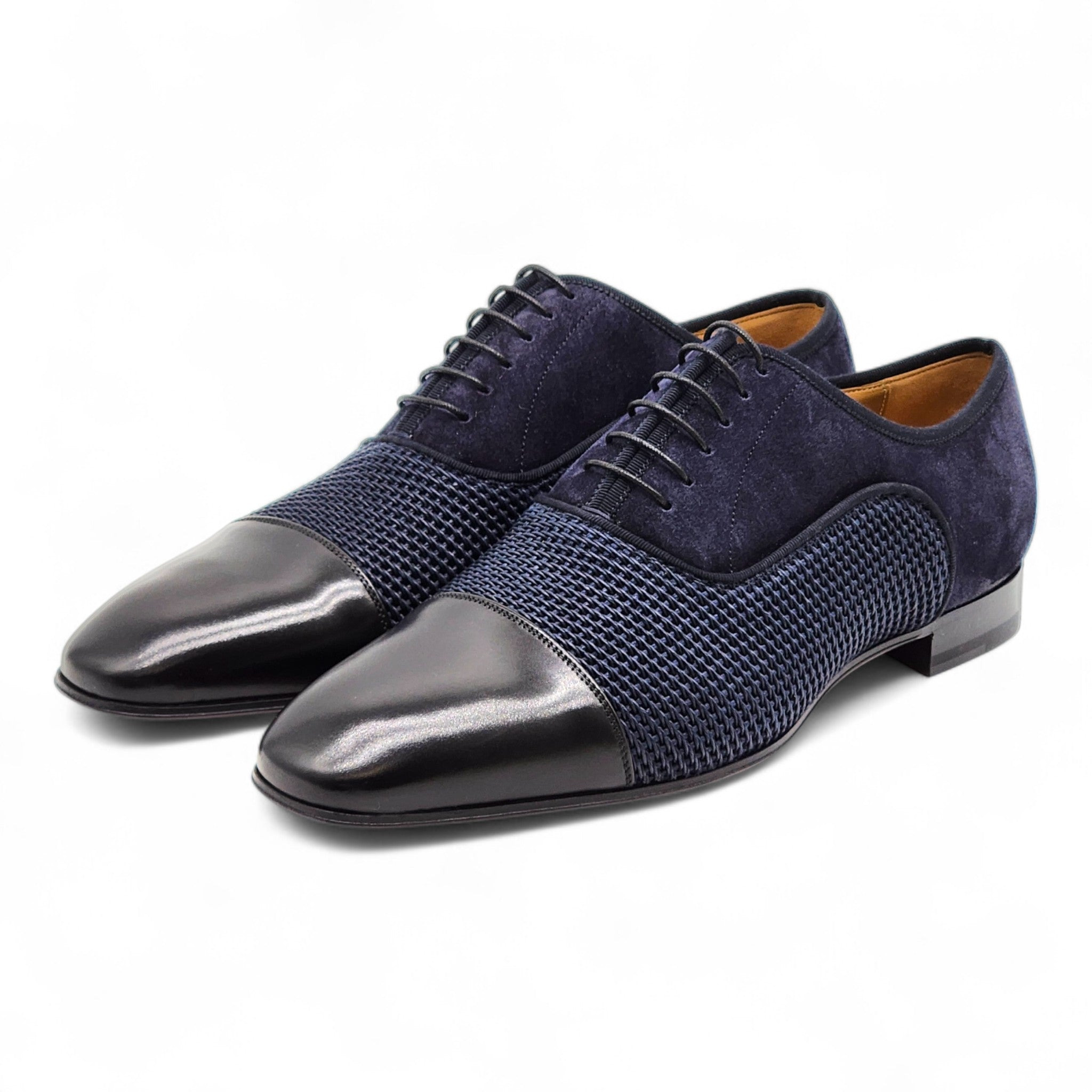 Christian Louboutin Greggo Oxford Shoes – Leather & Woven Fabric – Blue Condition: Brand new, unworn. Sample. Minor rubbing on the back. The Christian Louboutin Greggo Oxford is a sophisticated fusion of classic craftsmanship and contemporary design. This elegant lace-up Oxford features a refined combination of calf leather, suede and woven fabric , creating a unique texture that enhances its sleek silhouette. The Greggo exudes modern sophistication, making it a versatile choice for both formal and upscale casual occasions. The elongated toe and slim profile provide a polished, tailored aesthetic, while the iconic red lacquered sole adds the unmistakable Louboutin signature. • Material: Leather, Suede & Woven Fabric • Color: Blue, black • Style: Oxford lace-up • Design: Slim silhouette with an elongated toe • Sole: Signature red lacquered sole • Size: EU 42 / US 9 • Made in: Italy