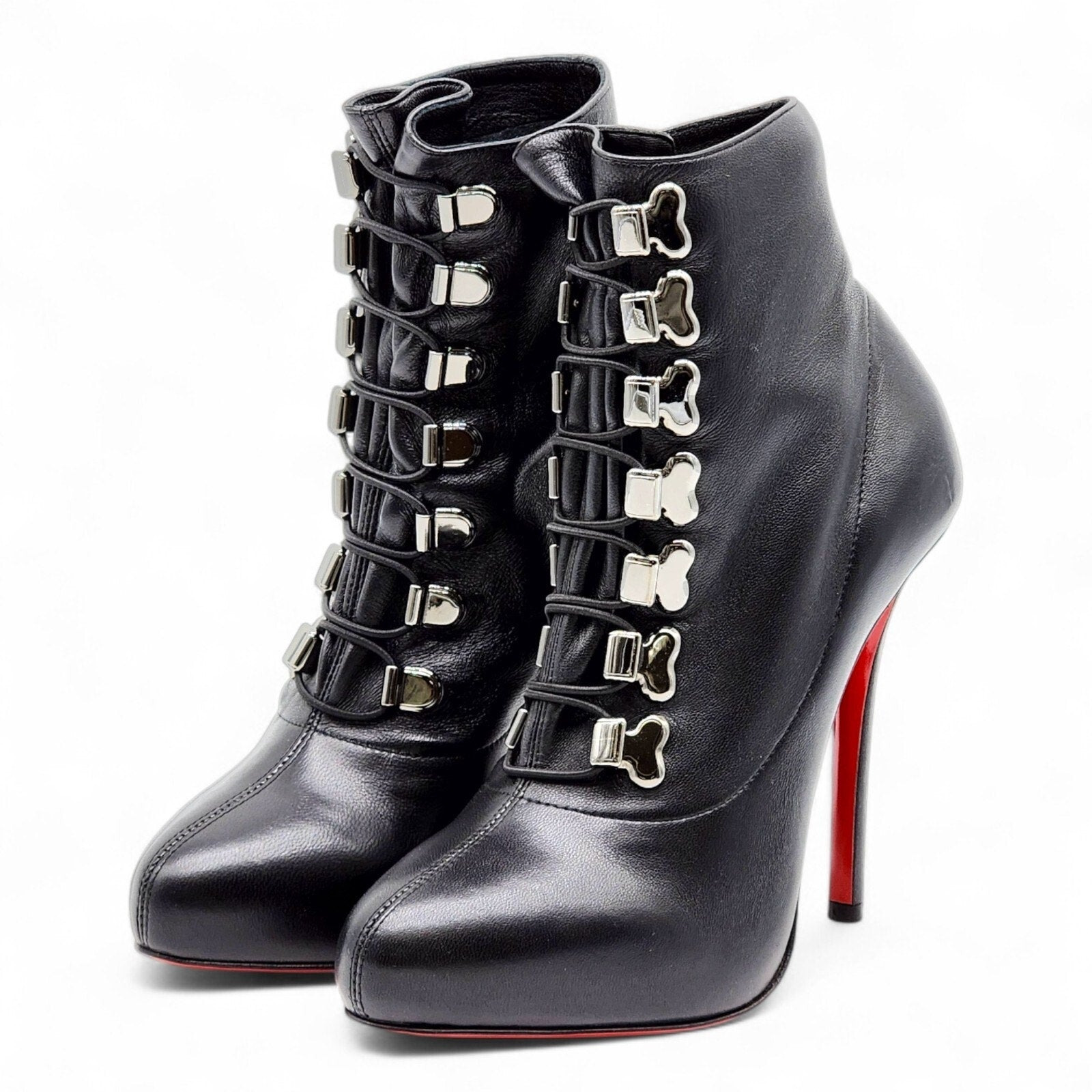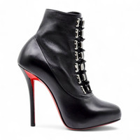Make a fierce statement in these authentic Christian Louboutin Troopista ankle boots – a commanding design that fuses military edge with signature red-sole sophistication. Crafted in smooth black leather, the pair is detailed with a bold lace-up front and gleaming silver-tone hardware, balanced by a sharply contoured silhouette. * Style: Troopista 120 * Size: EU 37 (US 6.5) * Heel Height: 120mm (4.75 inches) * Color: Black * Upper: Calf leather * Sole: Signature red lacquered leather * Made in Italy Condition: Brand new, never worn. Minor imperfections present from handling and storage—please review close-up images for reference. These include slight surface impressions and light creasing, not visible when worn. Includes: Original Christian Louboutin box and red dust bag This highly sought-after silhouette is rarely available in this condition. Due to limited availability and thin profit margins, price is firm. 100% authentic. A rare opportunity to secure one of Louboutin’s most powerful designs—don’t miss your chance to add this collector piece to your wardrobe.