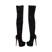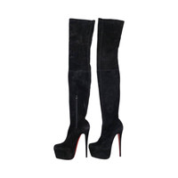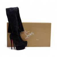 Christian Louboutin Gazolina Over-the-Knee Platform Suede Boots – Size EU 37 / US 6.5 – New Step into bold sophistication with these authentic Christian Louboutin Gazolina boots, crafted in supple black suede and finished with the brand’s iconic red lacquered soles. Designed with a dramatic stiletto heel and platform base, they offer striking height while maintaining timeless Parisian elegance. A true statement piece for any luxury footwear collection. Features: * Gazolina over-the-knee platform boots in black suede leather * Signature red lacquered sole * Ultra-high stiletto heel, approx. 6 in (152 mm) * Platform base, approx. 2.25 in (51 mm) * EU 37 / US 6.5 * Made in Italy * Includes original Christian Louboutin box * Condition: Brand new Authenticity & Company Info Since 1999, we have been serving customers worldwide with flawless reviews built on trust and quality. Every item is guaranteed 100% authentic, carefully inspected, and securely packaged for safe delivery. Firm Price Notice Due to small margins, pricing is firm. Thank you for your understanding.