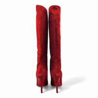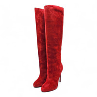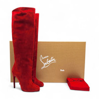 Christian Louboutin Vitish 100 Knee-High Boots - Carmin Red Suede - Style 3160477 - Size 37.5 Make a bold statement with these stunning Christian Louboutin Vitish 100 boots in rich Carmin red. This knee-high silhouette is crafted from luxurious suede and set atop the brand’s iconic red sole for an instantly recognizable look. A timeless style with a commanding presence. * Style: Vitish 100 * Color: Carmin Red * Material: Genuine suede leather upper * Sole: Signature red-lacquered leather sole * Heel Height: 100mm (4”) * Size: 37.5 (7 US) * Style Code: 3160477 * Made in Italy Condition: Brand new and never worn. Comes with original box and dust bag. 100% Authentic. Guaranteed. This is a rare opportunity to own an iconic pair of Louboutin boots in a show-stopping color. Inventory is extremely limited and pricing is firm due to small margins. A must-have piece for collectors and fashion enthusiasts alike.