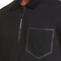 This shirt runs a size small. Size up. New with tags Black cotton piqué polo, zipper with heat-bonded black and white Adresse GIVENCHY band V-shaped breast pocket trimmed with a heat-bonded solid black band Small slits on the sides. Slightly longer cut in the back 100% Cotton Slim fit Made in Italy Medium: Length 29” (back) Pit 22” Shoulder 19.5”