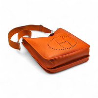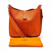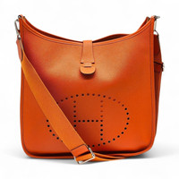 Hermès Evelyne III 33 Epsom Leather Crossbody Bag – Orange with Palladium Hardware Elevate your collection with this iconic Hermès Evelyne III 33, crafted from durable and lightweight Epsom leather in the house’s signature vibrant orange hue. Featuring the classic perforated ‘H’ logo on the front and accented with palladium-plated hardware, this bag offers both sophistication and everyday practicality. The adjustable canvas strap allows for versatile crossbody or shoulder wear, while the exterior back pocket adds extra convenience. * Color: Orange * Leather: Epsom (embossed-grain calfskin, known for structure and durability) * Hardware: Palladium * Dimensions: Approximately 12.8” L x 12” H x 3.5” D (33 cm x 31 cm x 9 cm) * Strap: Adjustable canvas strap for crossbody or shoulder carry * Origin: Made in France * Date Code: T BS 009 (2022) Condition: The bag was exclusively used for photoshoots, never for personal use. The exterior remains in excellent condition, showcasing the sharp structure and vibrant color of Epsom leather. The interior shows visible staining that can be professionally cleaned if desired. Signs of wear are noted on the strap attachments, as shown in photos. Includes: Hermès dust bag. All our items are 100% guaranteed authentic, carefully sourced from private collectors and trusted partners. Our pricing is firm as we operate with small margins while offering significant savings compared to retail. We are a boutique, family-run business with a long-standing reputation for authentic luxury, personalized service, and attention to detail.