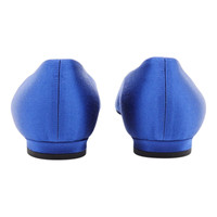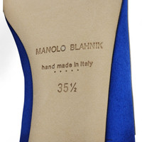Brand new without the box. Store price: $1095. Size: 35.5 (5 US). Blue satin almond toe flat pumps finished with a square crystal buckle encased in a gunmetal frame. Upper: 68% viscose, 32% silk. Sole: 100% cow leather. Lining: 100% kid leather. Heel measures 10 mm. Italian sizing. Made in Italy. Product ID: 9XX-0348-0041. Notes from Blahnik: "I always had a fondness for brilliant accessories, so we created a series of styles with this beautiful embellished buckle, which I found in Italy. The whole shoe was inspired by Napoleon I, Josephine and Pauline Bonaparte." - Manolo Blahnik