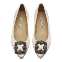 Manolo Blahnik Hangisiflat Jewel Buckle Flat Pumps Brand new without the box. Store price: $1095. Size: 36 (5.5 US). Blue satin almond toe flat pumps finished with a square crystal buckle encased in a gunmetal frame. Upper: 68% viscose, 32% silk. Sole: 100% cow leather. Lining: 100% kid leather. Heel measures 10 mm. Italian sizing. Made in Italy. Product ID: 9XX-0348-0047. Notes from Blahnik: "I always had a fondness for brilliant accessories, so we created a series of styles with this beautiful embellished buckle, which I found in Italy. The whole shoe was inspired by Napoleon I, Josephine and Pauline Bonaparte." - Manolo Blahnik