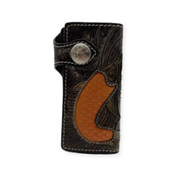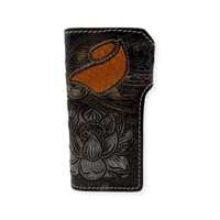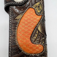 Handmade. A piece of art. Made by Rockertype Hand-curved leather. Leather interior. Incredible detail. Perfect for collectors. Measures 8” x 4” x 1.2” 10 credit card compartments. 4 open compartments 1 zippered compartment.