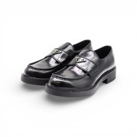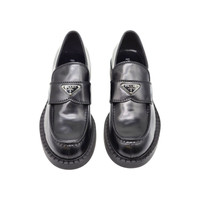 Prada Brushed Leather Loafers – Black – Triangle Logo – EU 46 / US 13 These Prada men’s loafers reflect timeless Italian craftsmanship with a refined modern edge. Crafted in Italy from sleek black brushed leather, they feature a clean apron-toe silhouette accented by the iconic Prada enamel triangle logo. Designed to transition seamlessly from formal settings to elevated everyday wear, this style offers both sophistication and versatility. The smooth leather lining and branded leather insole provide comfort, while the structured construction ensures a polished look suitable for business, formal occasions, or refined casual styling. * Size EU 46 / US 13 / UK 12 * Black brushed leather upper with polished finish * Slip-on loafer design with apron toe * Enamel triangle logo on vamp * Smooth leather lining and branded leather insole * Model: 2DE127 * Made in Italy * New with original box, dust bag, and authenticity cards We have been in business since 1999 with flawless customer feedback. All items are 100% authentic, carefully inspected, and securely packaged for safe worldwide delivery. Price is firm due to small margins.