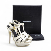 The Saint Laurent Tribute Sandals are a timeless icon, crafted in smooth white calfskin leather for sleek, modern elegance. Featuring a knotted front, slim T-strap silhouette, and signature high stiletto paired with a supportive platform, this cult-favorite design exudes sophistication and allure. Product Details: Condition: Brand New in Box (NIB) Retail Price: $1,100 Material: Calfskin leather Color: White Heel Height: approx. 5.5 in (140 mm) Platform Height: approx. 1.5 in (40 mm) Includes: Original Saint Laurent box Made in Italy Multiple sizes available Sizing Note: Runs true to Saint Laurent sizing. If unsure, we recommend visiting a boutique or authorized retailer to confirm your best fit prior to purchase. We have been trusted specialists in luxury fashion since 1999, offering 100% authentic, carefully curated items. Inventory is limited; don’t miss the opportunity to add this iconic Saint Laurent silhouette to your collection.