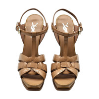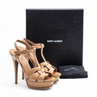 Saint Laurent Tribute Platform Leather Sandals Size: 40 (US 10) A timeless icon from the house of Saint Laurent, the Tribute platform sandal is a pinnacle of sleek, modern elegance. Crafted in smooth white calfskin leather, this sophisticated style features a knotted front design, slim T-strap silhouette, and the instantly recognizable high stiletto paired with a structured platform. * Retail price: $1,100 * Condition: Brand new in box (NIB) * Material: Calf leather * Color: Tan * Heel height: approx. 5.5 inches (140 mm) * Platform height: approx. 1.5 inches (40 mm) * Includes: Original Saint Laurent box * Made in Italy * Multiple sizes available Sizing note: We recommend purchasing your regular Saint Laurent size. If you are not familiar with Saint Laurent footwear sizing, we strongly suggest visiting a Saint Laurent boutique or an authorized retailer such as Saks Fifth Avenue to determine your best fit before purchasing. We are trusted specialists in luxury fashion with over 16 years of selling experience. All items are 100% authentic, carefully curated, and ready to ship. Inventory is limited—don’t miss the chance to own this cult-favorite silhouette from Saint Laurent.