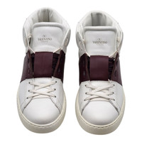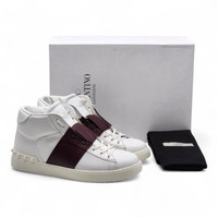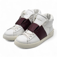 Valentino Garavani Women’s Rockstud Open High Top Sneakers White/Bordeaux - Style HYS00829-ABL R67 Step into luxury with these Valentino Garavani Rockstud Open High Top Sneakers. Crafted in Italy from smooth white leather with a bold black leather strap across the upper, this design effortlessly combines sporty silhouette with Valentino’s iconic elegance. The signature Rockstud detailing along the heel counter gives the pair its unmistakable brand identity. This highly sought-after model offers a refined, versatile look that pairs effortlessly with both casual and elevated outfits. Details: * Brand: Valentino Garavani * Style: Rockstud Open High Top Sneakers * Style Code: HYS00829-ABLR67 * Color: White/Bordeaux * Size: 40 EU (Women’s US 9.5, Men's US 7) * Material: Leather upper, rubber outsole * Made in Italy * Includes original box and dust bag * UPC: 8059296698479 Condition: Brand new with original box and dust bag. The box is damaged. Authenticity is always 100% guaranteed. Our inventory is sourced directly from authorized Valentino distributors. Pricing is firm due to limited availability and high demand.