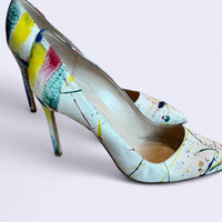 Manolo Blahnik Paint Splatter Heels 40 Unique canvas pumps with an artistic paint splatter print and sleek 4.25 in heel. 🎨 #manolos #satc #carriebradshaw paint splatter, canvas heels, artistic footwear, high heel pumps, colorful print, statement shoes, designer heels, sleek stilettos, vibrant pattern, luxury footwear