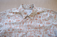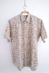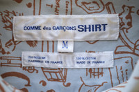Comme des Garçons SHIRT Collection: Archive (1990s) Composition: 100% cotton Made in France. This archival top from the CdG SHIRT line is in excellent used condition, the first owner purchased it directly from CdG in the late 1990s. This unique print showcases a rich tapestry of varied iconography and symbols including both Latin and Cyrillic scripts alongside Arabic numerals. Pastoral themes, everyday items, and abstract symbols in a muted earthy tone against the lighter background creates a visual narrative that is both chaotic and cohesive, a perfect encapsulation and representation of the Comme des Garçons avant-garde design aesthetic. The cultural and linguistic references are broadly Slavic, and perhaps a post-Soviet cultural context that encompasses culture and history ranging from Eastern Europe to Eastern Asia. A cultural and historical reflection on this broad region post-USSR, blending symbols from multiple former Soviet states. The print contains letters from the Cyrillic script, used in languages across many Cyrillic-using Slavic cultures. Some of the recognizable letters include "Ч" (Che), "Ш" (Sha), "П" (Pe), and "Б" (Be). There are also complete words and phrases. For example, "Юра" (Yura), which is a common male name, and "Вова" (Vova), a diminutive form of the name Vladimir. "Киев" (Kiev) is also visible in the print, which is the capital of Ukraine. The print also includes illustrations that represent elements from across the Cyrillic-using Slavic cultures, history, and folklore. Images of trees, animals, musical notes, and everyday objects, blending practicality of everyday life with metaphor and myth. Approximate Measurements: • Chest: 23 ⅜” (59.5 cm) • Length: 31 ⅛” (79 cm) • Shoulders: 19 ¼” (49 cm) • Sleeve Length: 10 ¼” (26 cm) • Hem: 25” (63.5 cm) Offers welcome. Please ask all questions before buying. Items are as pictured and described. Shipping from British Columbia, Canada. Final sale, no returns. For more avant-garde collecting: @ehtersono