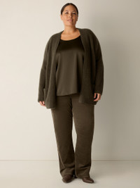 Blissfully soft. A long cardigan with a high collar and open front. In a textural blend of cashmere and silk—one of our softest and most luxurious yarns. Style No. F5MPS-K5447 DESIGN - Designed with a generous, boxy fit that drapes away from the body to create movement. - Black cardigan only available online and in our LAB store. - Kalyane is 5'10" and wears a size S in Ink, which measures 24 1/2 inches on the body. Size PS measures 23 inches on the body. Size 1X measures 27 1/2 inches on the body. - High neck, open front, drop shoulder. - Front knit-in pockets. - Style No. F5MPS-K5447 FABRIC - One of our softest yarns, an Italian boucle with textural poufs of cashmere and silk. - Hand wash cold. Do not wring. Reshape and lay flat to dry. May snag on jewelry. - Made in Romania. 72% Cashmere/17% Silk/10% Recycled Nylon/1% Elastane. SUSTAINABILITY - This fiber is certified to the Sustainable Fibre Alliance Cashmere Standard and is produced in a way that protects animal welfare and promotes safe working conditions.