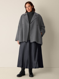 A modern take on a timeless shape. The trench coat with a button front and short silhouette, in recycled wool that's brushed for extra softness. Made in a Fair Trade Certified™ factory. Style No. F5CIK-C2166 DESIGN - Close at the shoulders, wider at the hem. A silhouette that fits the body with ease. - Kalyane is 5'10" and wears a size S, which measures 29 inches on the body. Size 1X measures 31 1/2 inches on the body. - Notch collar, button front with corozo buttons. - Inverted back box pleat, welt pockets. - Style No. F5CIK-C2166 FABRIC - Luxuriously soft and lightly brushed for a sensuous feel. Our plush wool is double woven so it's refined inside and out. This innovative recycled wool yarn comes from a mill in Italy that's redefining textile-to-textile recycling. - Dry clean only. - Made in Indonesia. 85% Recycled Wool/13% Wool/2%Other. SUSTAINABILITY - Our Fair Trade Certified™ factories meet rigorous social and environmental standards. By choosing Fair Trade Certified™ products, you’re helping to improve the lives of workers, build resilient communities and protect the environment.