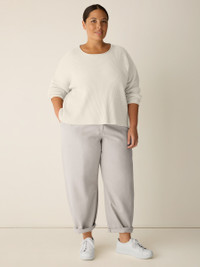The arch pant. A modern silhouette with a relaxed barrel shape, in textural organic cotton. Made in a Fair Trade Certified™ factory. Style No. S6QVB-P4873 DESIGN - Subtle parallel curves create an arch shape through the leg, slightly tapered at the ankle. - Only available online. - Drew is 5'9" and wears a size XS in Papyrus. - 1 1/2-inch elastic waistband, belt loops, fly front with button and zipper closure. - Front slash pockets, darts at the knees. - 11-inch rise; 27-inch inseam; 8-inch leg opening (size XS). 11-inch rise; 25-inch inseam; 7-inch leg opening (size PS). 13-inch rise; 27-inch inseam; 9-inch leg opening (size 1X). - Style No. S6QVB-P4873 FABRIC - Inspired by workwear. A medium-weight textural weave with the softness of organic cotton. We dye the whole garment so that both the thread and fabric acquire a deep, saturated color. - Machine wash cold. Tumble dry low. Color transfer may occur. - Made in Indonesia. 100% Organic Cotton. SUSTAINABILITY - Our Fair Trade Certified™ factories meet rigorous social and environmental standards. By choosing Fair Trade Certified™ products, you’re helping to improve the lives of workers, build resilient communities and protect the environment. - Organic farming supports clean water and healthy soil.