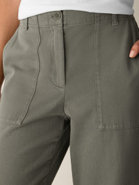 A relaxed tapered pant with the soul of a jean, in textural organic cotton. Made in a Fair Trade Certified™ factory. Style No. S6QVB-P4830 DESIGN - A silhouette designed to taper at the ankle. Fits the body with ease. - Astrid is 5'9" and wears a size S in Papyrus. - Fly front with button and zipper closure. - Front slash pockets, back patch pockets. - Belt loops, back darts for shape. - 10-inch rise; 29-inch inseam; 7 1/2-inch leg opening (size XS). 10-inch rise; 27-inch inseam; 7-inch leg opening (size PS). 13-inch rise; 29-inch inseam; 9-inch leg opening (size 1X). - Style No. S6QVB-P4830 FABRIC - Inspired by workwear. A medium-weight textural weave with the softness of organic cotton. We dye the whole garment so that both the thread and fabric acquire a deep, saturated color. - Machine wash cold. Tumble dry low. Color transfer may occur. - Made in Indonesia. 100% Organic Cotton. SUSTAINABILITY - Our Fair Trade Certified™ factories meet rigorous social and environmental standards. By choosing Fair Trade Certified™ products, you’re helping to improve the lives of workers, build resilient communities and protect the environment. - Organic farming supports clean water and healthy soil.