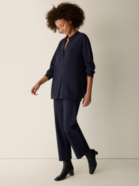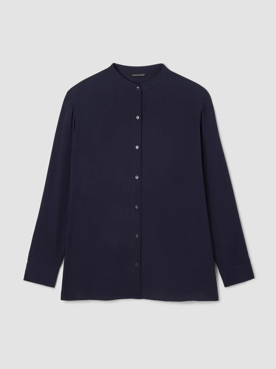 Polished and versatile. A drapey band collar shirt with a button front, in our signature Silk Georgette Crepe. Wear it day or night. Style No. S6GC1-T6108 DESIGN - Close at the shoulders, wider at the hem. A silhouette that fits the body with ease. - Ink shirt only available online. - Kalyane is 5'10" and wears a size S in Skylight, which measures 29 inches on the body. Haejin is 5'5" and wears a size PS, which measures 27 inches on the body. Ryan is 5'8" and wears a size 1X, which measures 31 1/2 inches on the body. - Band collar, button front and button cuffs with double pleat. - 7-inch side slits, back yoke with center back pleat. - Mother-of-pearl buttons. - Style No. S6GC1-T6108 FABRIC - Light, fluid and versatile. Silk with a subtly textured matte surface that we've counted on since 1999. - Machine wash cold. Line dry. - Made in Indonesia. 100% Silk. SUSTAINABILITY - This fabric is bluesign® APPROVED. It's dyed with safer chemistry using less water and less energy, meeting the bluesign® CRITERIA.